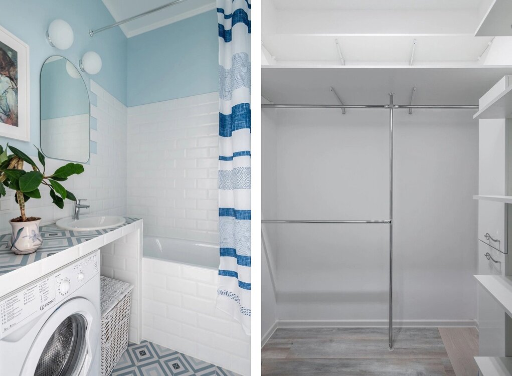 За счет уменьшения площади комнаты удалось выделить место под небольшую гардеробную.